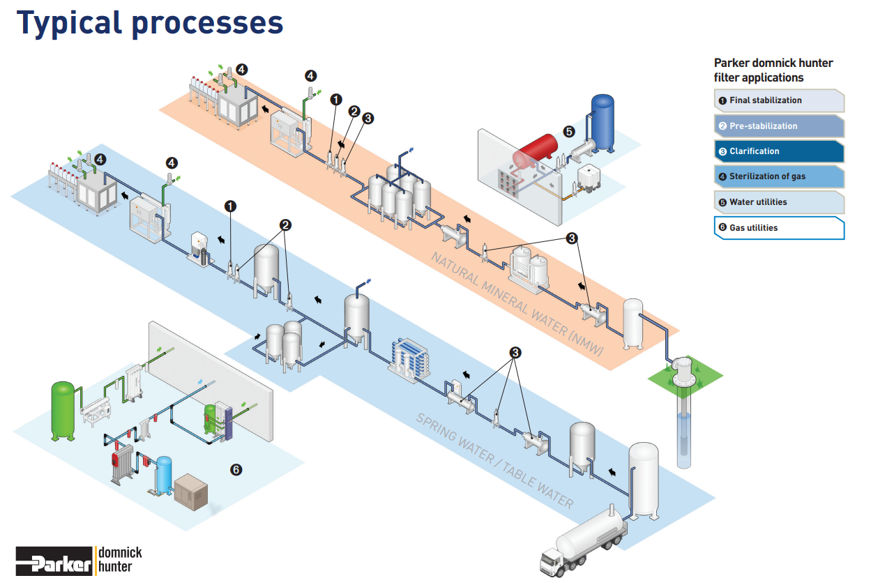 „Parker“ filtrai skaidrina natūralų mineralinį vandenį, pašalindami smulkias suspenduotas daleles, ir sterilizuoja filtruotą vandenį, eliminuodami visas daleles, įskaitant koloidus ir bakterijas iki 0,2 µm dydžio. Šie mikrofiltracijos sprendimai taip pat padeda sumažinti didelį kiekį geriamajame vandenyje esančių mikroplastikų, kurie, kaip manoma, susidaro pačio buteliavimo proceso metu.